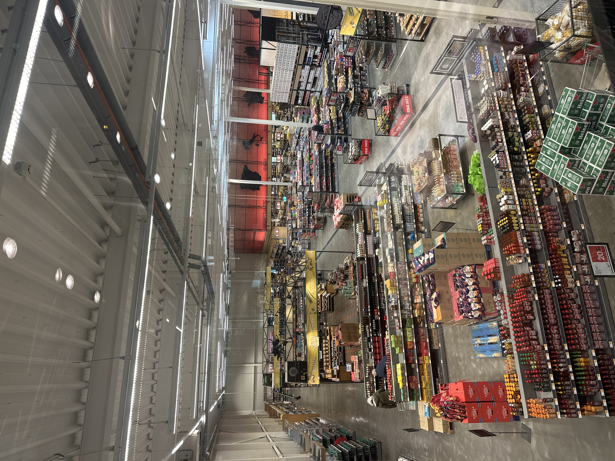 The image captures a high-angle view of the interior of a large supermarket, specifically identified as Flevo Food Market located at S