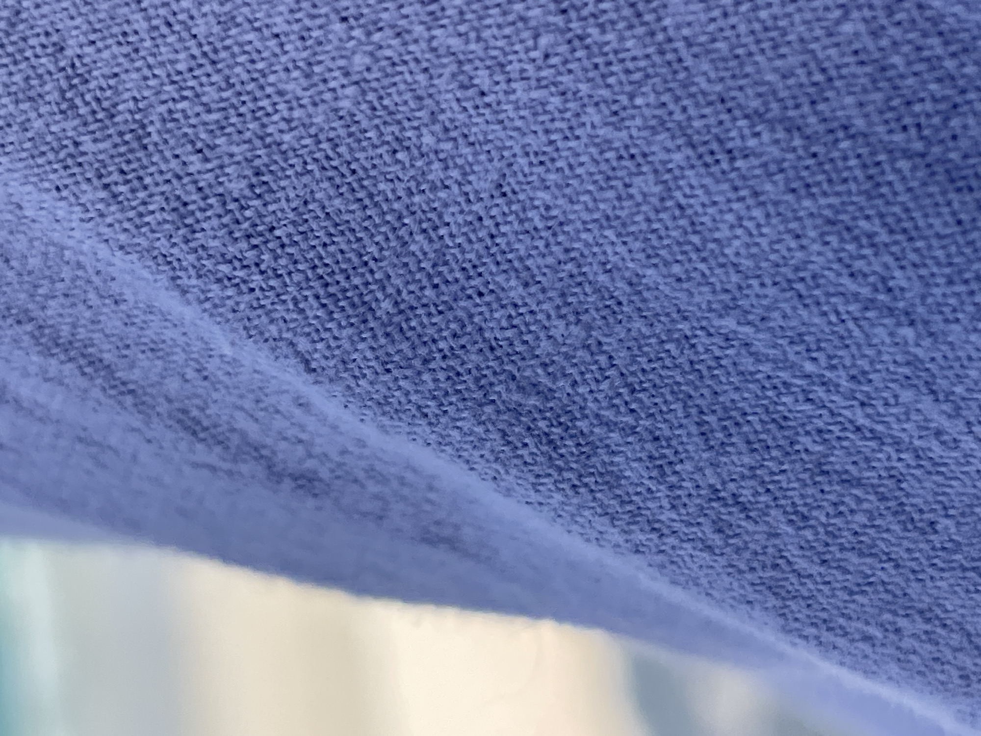 close-up of a blue knitted fabric. The weave is visible, and the fabric appears to be draped or folded. The lower portion of the image is out of focus, revealing a blurry light-colored area, possibly reflecting light from an unseen source. There are no people, subjects, objects, actions, or interactions depicted in the scene. The environment appears to be undefined beyond the immediate fabric and blurred background. No information in the image is connected to Dong Ninh Hoa, Vietnam.