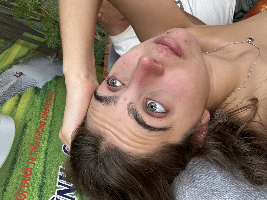 A woman is lying down, looking up at the camera. She has light skin, brown hair, and gray eyes. She is wearing a silver necklace and earrings. Her left arm is raised, with her hand behind her head. A man can be seen in the background wearing a white shirt. A green and yellow printed mat is underneath her left arm. The overall composition is slightly tilted.
