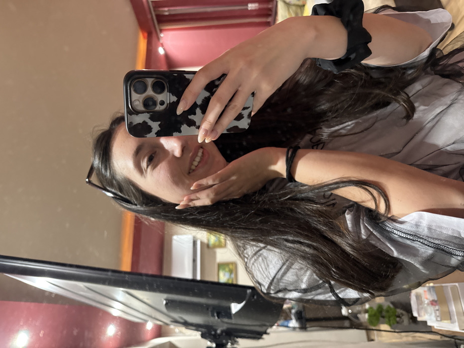 A young adult female is depicted in an indoor setting in the city of Galabovtsi, Bulgaria, capturing a mirror selfie with a smartphone. The female has long, dark hair with glasses resting on top of her head. She is wearing a grey t-shirt, a black bracelet on her left wrist, and a black scrunchie on her right wrist. Her right hand is gently touching her right cheek, and she is smiling, revealing teeth. Her fingernails are light-colored. She holds a smartphone with a black and white cow-print case in her left hand, facing the mirror. The reflection in the mirror shows a room with light-colored walls and a ceiling featuring red-orange accent lighting along the perimeter. A large, black flat-screen television is mounted on the wall to the left, with an air conditioning unit visible above it. Below the television, a small potted plant and other objects are visible on a surface. Two framed pictures hang on the wall further back, and a patterned sofa or cushioned furniture is partially visible in the bottom right corner of the reflection.