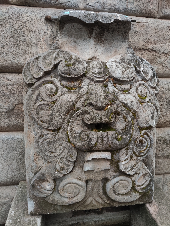 A weathered stone fountainhead, carved with a grotesque face, is set against a stone block wall