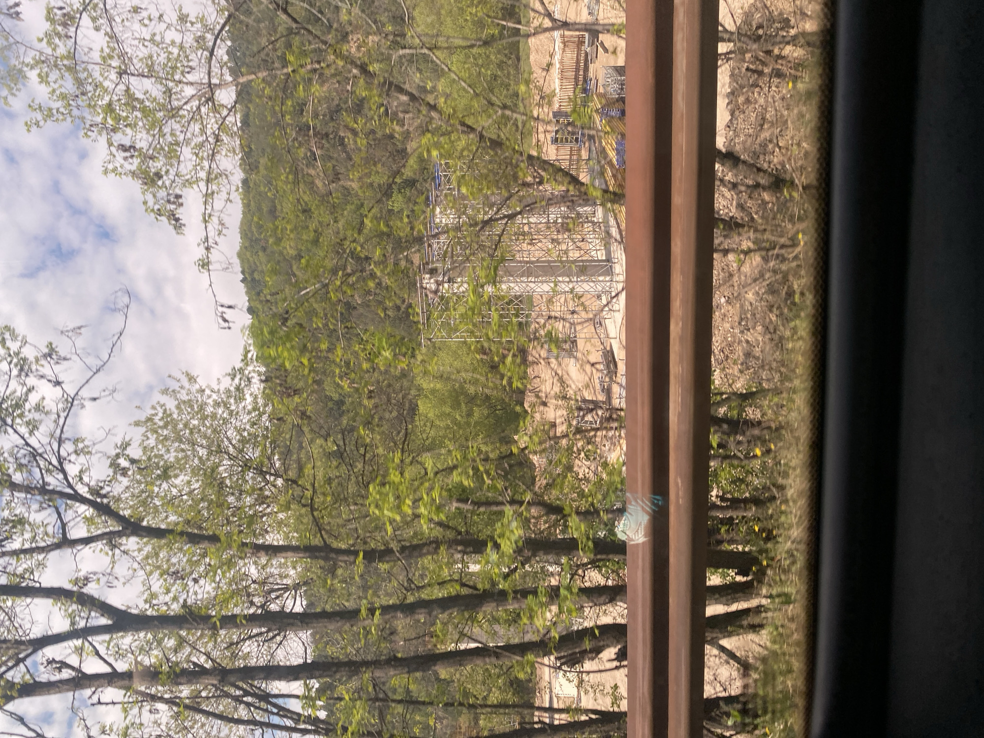 landscape scene in what appears to be a natural or rural area, likely near Kresna, Bulgaria. A wooded hill or mountain is partially visible in the background, covered with trees and vegetation. In the foreground, there's construction scaffolding. A metal barrier or guardrail runs vertically through the frame, obscuring the view, suggesting the photo was taken from a vehicle or structure. The color palette consists of browns, greens, and shades of gray. Sky and clouds are seen.