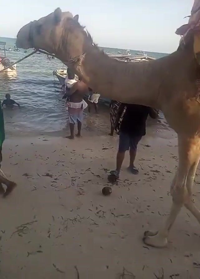 camel standing on a sandy beach near the ocean. The camel has a saddle with a floral patterned cover. There are several people around the camel, some near boats on the water's edge. Some people are in the water. The beach is covered with seaweed.