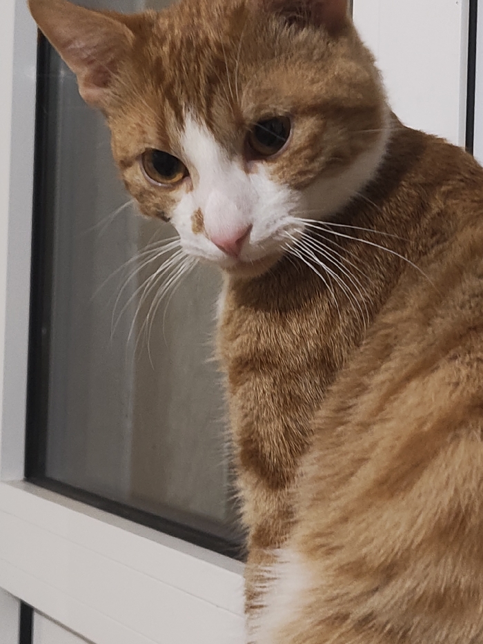 - "An orange and white domestic cat is positioned on the right side of the frame, partially obscuring a white window frame and dark windowpane visible behind it on the left" by FM-aczzF3, licensed under CC BY 4.0