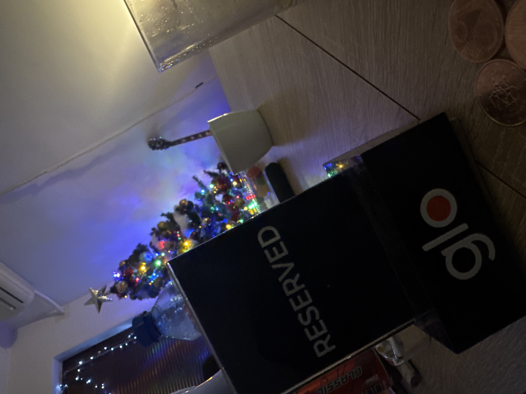 The image displays an indoor setting, likely a private residence, located in Sofia, Bulgaria. The scene is dominated by a black rectangular object in the foreground, which serves as a stand. Its front face clearly displays the word "RESERVED" in white capital letters. Below this, towards the bottom of the object, the brand logo "glo" with a red circle is visible. To the immediate right of this object, a clear glass with what appears to be condensation or water droplets is partially visible. On the wooden surface below the "glo" object, three copper-colored coins are resting. Behind the foreground objects, the wooden surface extends, holding a plastic water bottle with a blue cap positioned behind the "RESERVED" stand. Further back and to the right, a small white ceramic cup is present. The midground features a decorated Christmas tree adorned with multi-colored lights and topped with a silver star. The background consists of a light-colored wall, which exhibits a bluish-purple hue due to ambient lighting. An air conditioning unit is mounted high on this wall. To the far left, a window with horizontal blinds is visible, strung with small white decorative lights. A dark, slender object, possibly the neck and headstock of a stringed musical instrument like a guitar, leans against the wall between the white cup and the Christmas tree. No individuals or active interactions are depicted in the scene. The lighting suggests an evening or low-light condition, enhanced by the decorative lights.