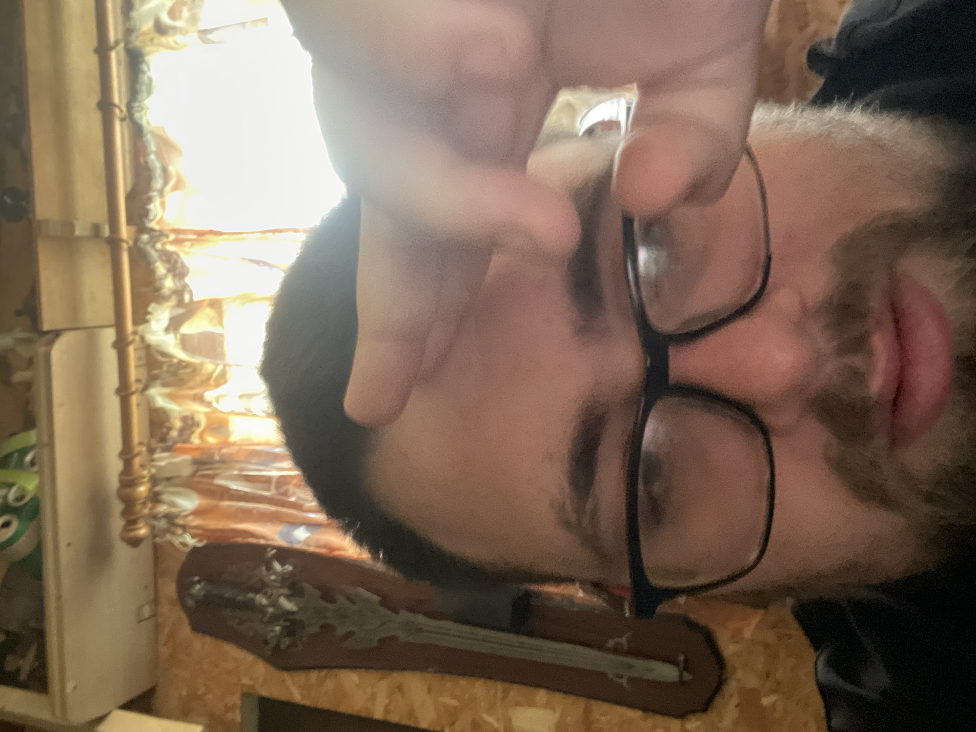 A person wearing glasses is positioned in front of a wall with wood paneling and patterned curtains. A decorative sword is mounted on the wall below. The person's hand is partially obscuring the view. A green toy is visible in the background.