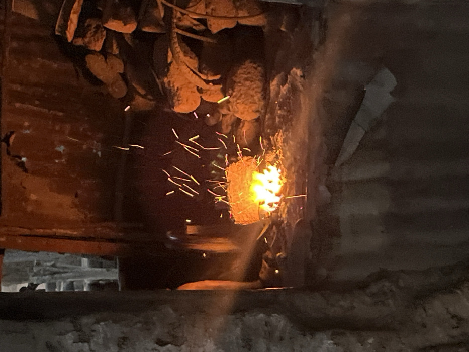 A vibrant blaze engulfs a wooden block, radiating outward as sparks scatter and dance in the air. The surrounding environment is dimly lit, revealing dark, textured surfaces of brick or stone. A metallic structure looms above the fire, casting long shadows. The composition is claustrophobic, emphasizing the isolated intensity of the fire.