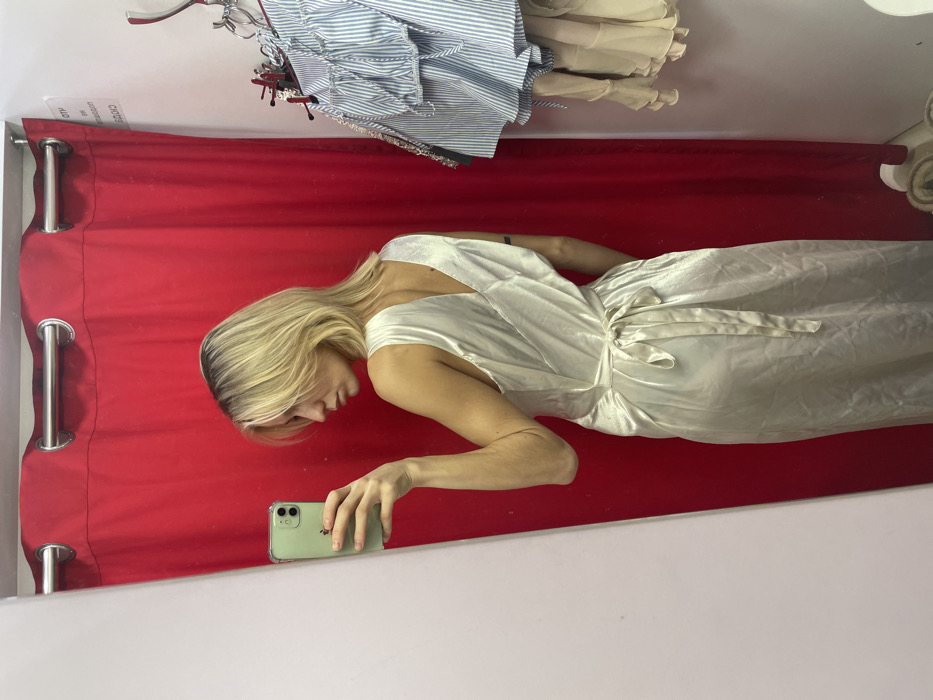 A female individual with shoulder-length blonde hair is depicted in a mirror selfie within a retail changing room. She is wearing a light-colored, possibly champagne or off-white, sleeveless gown with a V-neck back and a tied sash at the waist, observed from a rear-right perspective. Her right hand holds a light green smartphone, positioned to photograph her reflection. The changing room features a red fabric curtain enclosure with silver grommets, a plain light pink wall bordering the mirror to the left, and a multi-hook metallic clothes rack to the right, which holds various garments including a blue and white striped off-shoulder top. A white sign with partially visible Cyrillic text ("ОТР" and "ЗАХОДО") is affixed to the wall above the clothes rack. This scene takes place in a clothing store fitting room in Moscow, Russia.