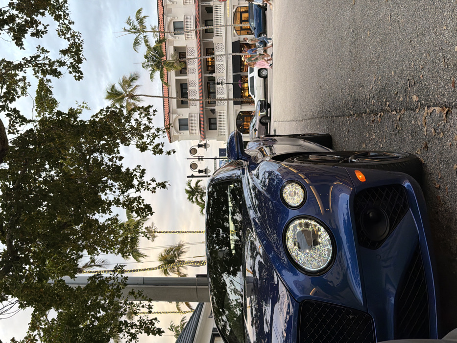 The image depicts a street scene on Fifth Avenue South in Naples, Florida, United States of America, during late afternoon or early evening under an overcast sky. In the foreground, the front-left section of a dark blue Bentley Continental GT is prominently featured, parked or stopped on the right side of the asphalt road. Its two circular headlights are illuminated with a bright, crystalline appearance, and an amber side marker light is visible on the fender. The car's surface reflects ambient light and surrounding foliage. Scattered dry leaves lie on the asphalt curb-side next to the vehicle. In the midground, the paved street extends into the distance. A group of approximately five pedestrians, including individuals in shorts, shirts, and one in a pink dress, are walking across the street from left to right in what appears to be a crosswalk or designated pedestrian area. Various vehicles are visible further down the road, including a white SUV, a grey sedan/SUV, and a dark SUV. Ornate, dark-colored street lamps with multiple luminaires are positioned along the street. The background features multi-story buildings with white stucco facades, multiple balconies with white balustrades, and red tile roofs, characteristic of Mediterranean Revival architecture. One building prominently displays a partial sign with the word "FIFTH". Numerous tall palm trees, some with string lights wrapped around their trunks, are scattered throughout the scene. Large, leafy tree branches hang into the upper portion of the frame, partially obscuring the sky and some distant palm trees.