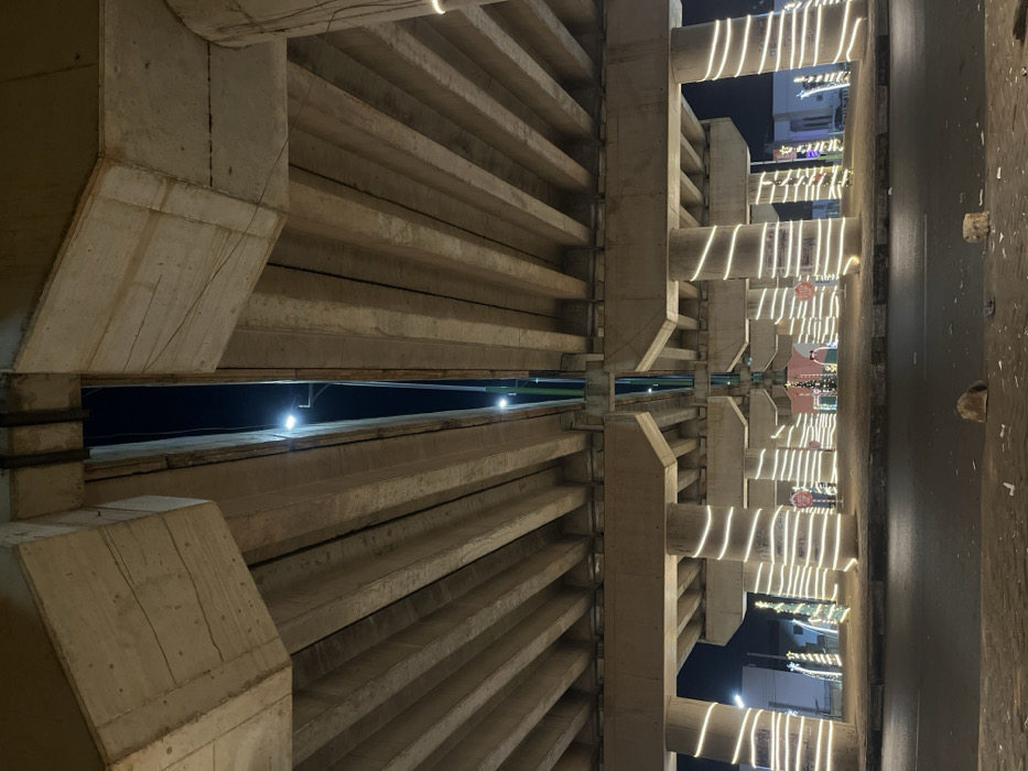 A low-angle perspective captures the underside of a concrete bridge with repetitive, parallel beams. Ambient light filters through, contrasting with the dark sky above. String lights adorn the bridge's support structures, creating vertical lines of illumination. A glimpse of buildings and street activity is visible beyond the bridge's edge. The photograph's composition emphasizes the bridge's architectural form and its interaction with urban surroundings.