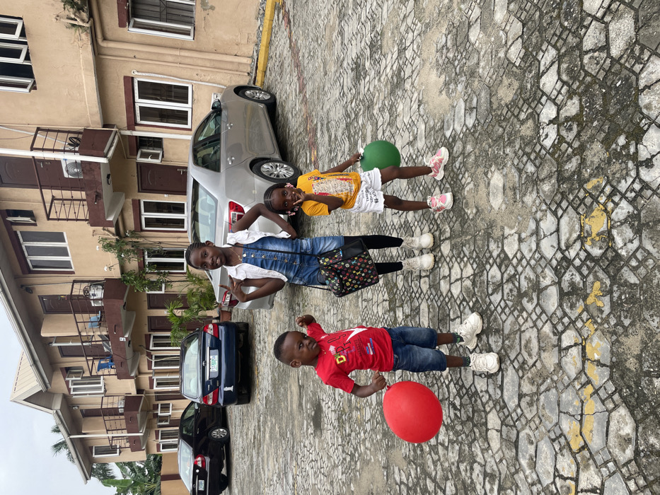 - "An outdoor scene in Ado, Nigeria, depicts three children standing on a worn, geometrically patterned paved surface in front of a light brown, two-story building under an overcast sky" by FM-pkoDq2, licensed under CC BY 4.0