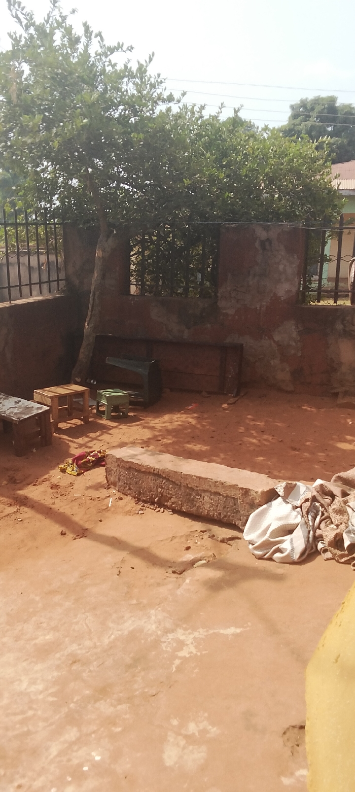 The image displays an outdoor, unpopulated scene within the city of Unknown, Unknown, characterized by a reddish-brown dirt ground partially shaded by foliage. Bright daylight casts distinct shadows. In the immediate foreground, the ground appears as a lighter, compacted surface transitioning to rough dirt. A substantial, rough-hewn concrete or stone block lies horizontally in the mid-ground, with a pile of light-colored, crumpled fabric to its right. To the left of this block, a smaller bundle of red and yellow fabric is present on the dirt. Further left, three small, distinct stools are arranged: a dark, weathered rectangular stool, a light brown wooden square stool, and a green plastic square stool. Behind these, a dark green object, possibly a metal frame or piece of furniture, rests on its side, alongside a long, dark rectangular object, potentially a wooden board, leaning against a wall. The background is dominated by a reddish-brown wall exhibiting patches of faded plaster and sections of black metal grating. A large, deciduous tree with dense green foliage grows behind the wall, its trunk visible near the center. Additional green foliage and the reddish-orange roof of a distant building are visible above the wall and trees, under a bright, clear sky. No individuals are observed within the frame.
