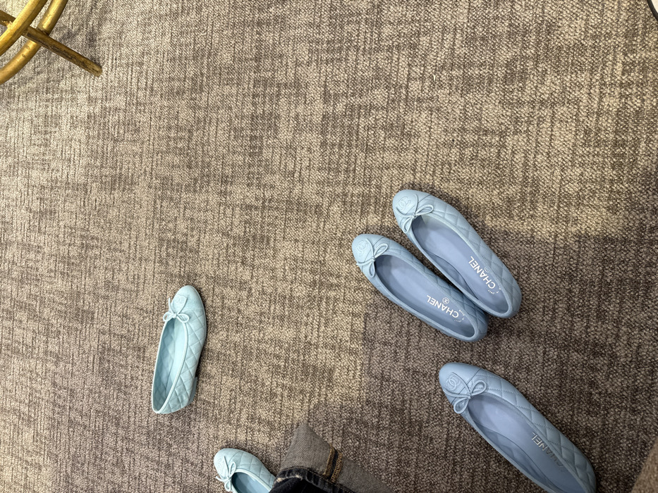 The image displays an interior scene from a luxury retail environment in San Diego, United States of America. The floor is covered by a light brown, textured commercial-grade carpet. Five light blue Chanel ballet flats are distributed across the carpet. Each shoe features a quilted exterior, a decorative bow on the toe, and an embossed Chanel interlocking 'C' logo positioned below the bow. The visible interior soles of some shoes clearly display the "CHANEL" brand name. A portion of a person's lower leg, clad in dark denim jeans, is visible in the bottom left quadrant, indicating the presence of an individual. A curved, gold-colored metallic furniture leg or display stand is partially visible in the upper right corner.