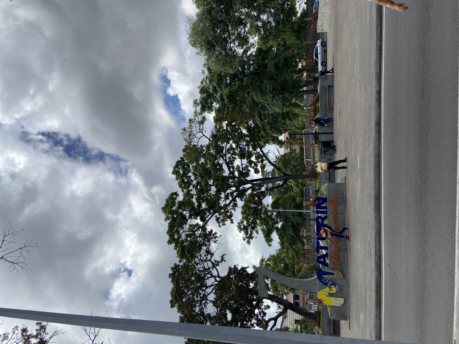 The image displays an urban plaza in Maturín, Venezuela, under a partly cloudy sky with visible patches of blue