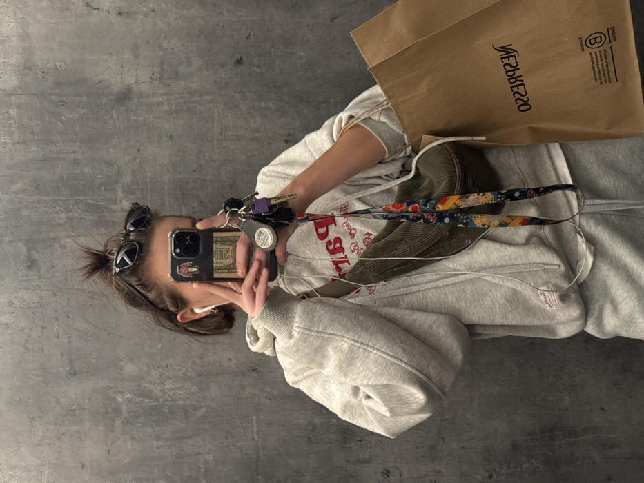 A mid-shot, mirror selfie captures an individual against a dark gray, textured wall. The person's face is obscured by a dark-cased smartphone, which they hold with both hands. Dark sunglasses are perched on their head, above short dark hair styled in a small bun. They wear a light gray hooded sweatshirt with red text "1987 PARIS" visible on the front, and matching light gray sweatpants. White wired earbuds are present in both ears. Attached to the smartphone, or held adjacent to it, is a keyring with multiple metallic and purple keys, along with a dark leather keychain inscribed "Le Carré Blanc," indicating a specific location in Strasbourg, France. An olive green corduroy fanny pack is worn diagonally across the individual's chest, featuring a colorful patterned strap. In their right hand (viewer's left), they hold a brown paper shopping bag displaying the reversed "NESPRESSO" logo and French text "Entreprise B certifiée."