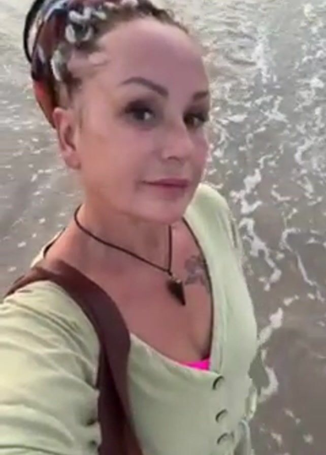 woman standing in shallow ocean water. She is fair-skinned with blonde hair styled in braids, accessorized with a colorful headband. She is wearing a light green, long-sleeved dress or top over what appears to be a bright pink top. A brown leather purse or bag hangs from her shoulder, and she wears a dark-colored necklace with a triangular pendant. A small tattoo is visible on her chest. The woman looks directly at the camera and smiles slightly. She gestures toward the ocean with her right hand, showing the waves rolling onto the sandy beach. The ocean is calm, and the sky appears overcast. The shot is from a close-up, selfie perspective.