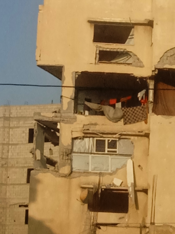 A tan, dilapidated apartment building with visible damage and missing sections stands against a light blue sky. Upper floors have empty window frames, and one level is completely open, revealing hanging clothes and makeshift dividers. Lower down, a window air conditioner is visible. A newer, partially constructed brick building stands in the background, juxtaposing the older structure's decay. Wires crisscross the scene.