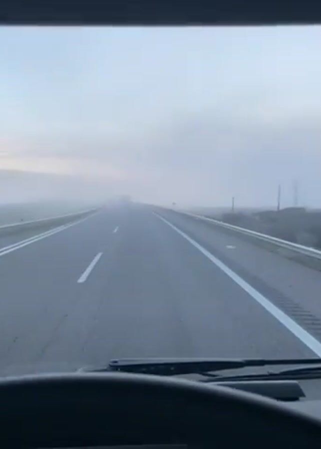 view from inside a vehicle driving down a straight, two-lane highway. The road is marked with white lines. Visibility is low due to dense fog. The sky is a pale blue, indicating it is likely early morning or late evening. The dashboard and steering wheel of the vehicle are visible in the foreground. The speedometer reads "88". The surrounding landscape appears to be flat and rural. In the distance, the faint shapes of other vehicles can be seen through the fog.