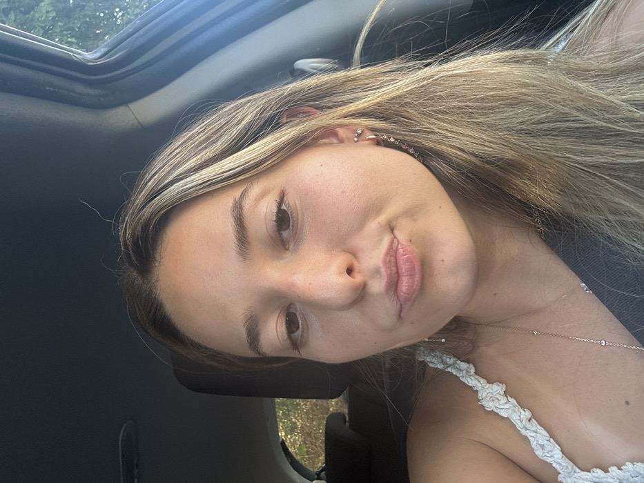 A light-skinned female individual is depicted in a close-up selfie, positioned inside a vehicle in Herzliya, Israel