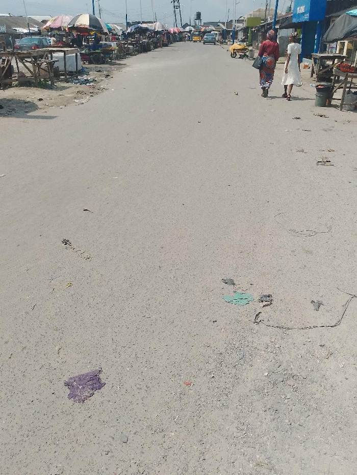 - "The image presents an eye-level view of a wide, unpaved or gravely grey road under an overcast sky, located in a market area of Mgbuoshimini, Nigeria" by FM-ZCxj33, licensed under CC BY 4.0