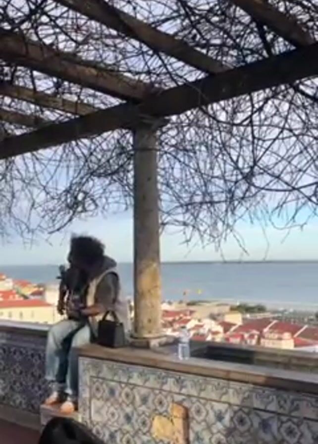 A man sits on a tiled ledge under a wooden trellis playing a guitar and singing. He has dark curly hair, wears a vest over a hooded sweatshirt, jeans, and sneakers. A guitar case lies next to him, and a bottle of water sits on the ledge. The ledge is decorated with blue and white patterned tiles. Behind him is a view of rooftops and the ocean under a clear blue sky. The trellis above is covered with bare vines.