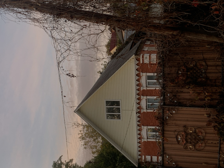 The image depicts a residential scene in Bohuslav, Ukraine, under a partially cloudy sky exhibiting soft pink and orange hues indicative of dawn or dusk. The primary subject is a two-story house, partially obscured by foreground elements. The first floor of the house features a red brick facade with three visible rectangular windows framed in white decorative trim, topped by a white frieze. A faint house number "12" is visible on the brickwork to the right of the central window. The second story, forming a gable end, is clad in light yellow horizontal siding and contains a single, multi-pane rectangular window centered below a steep, dark gray shingle roof. In the foreground, a dark brown fence or gate with ornate dark metal scrollwork, possibly accented with faded gold, stretches across the lower portion of the frame. Extensive dried, reddish-brown vines heavily cover both the fence/gate and a thick, dark vertical structure, likely a pole or tree trunk, positioned on the right side of the image. Scattered remnants of reddish-brown leaves cling to these dormant vines. A thin wire is visible stretching horizontally across the upper-middle distance, partially entwined with the bare vines. Green foliage from trees is visible on the left and in the background, with glimpses of other residential structures beyond the main house. No individuals or discernible actions are present in the scene.