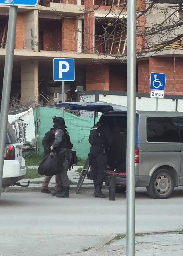 several law enforcement officers in uniform, some wearing tactical gear, standing by a gray van. The rear door of the van is open, and officers are seen moving items in and out of the vehicle. One officer carries a large black bag on his shoulder. A white SUV is parked nearby. The setting appears to be a street in a residential area, with construction in the background. Street signs are visible, including a crosswalk sign and a parking sign.