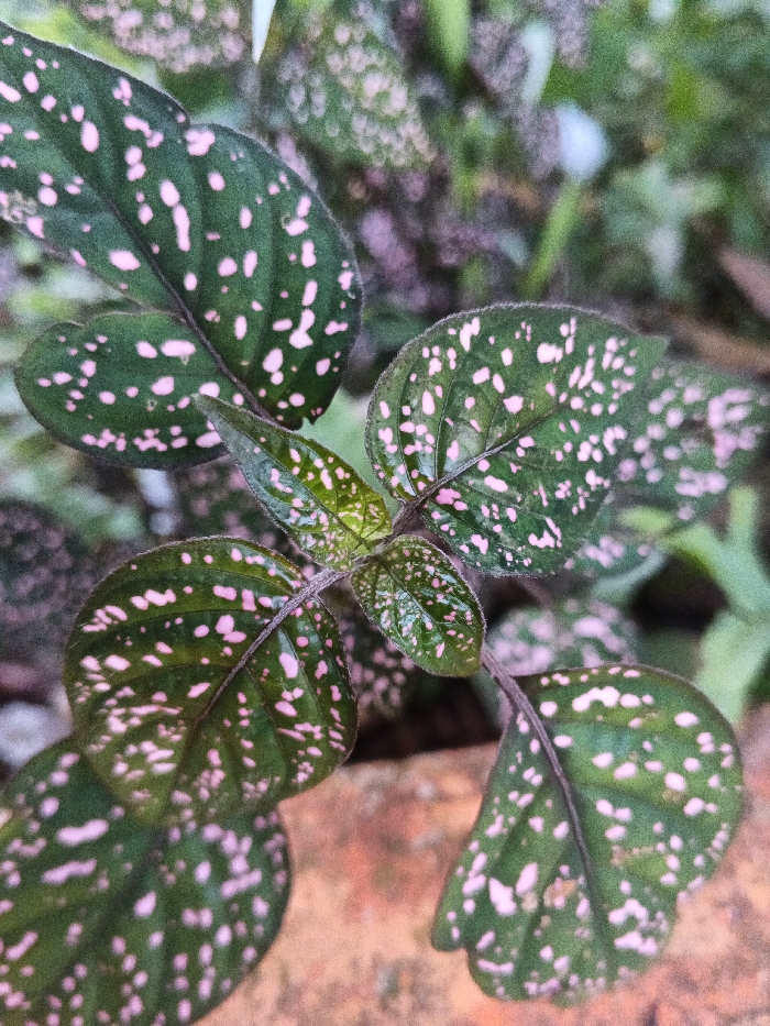 - "The image presents a close-up, top-down perspective of a plant featuring dark green, ovate leaves heavily variegated with numerous irregular pink speckles and splotches" by FM-HDizq2, licensed under CC BY 4.0
