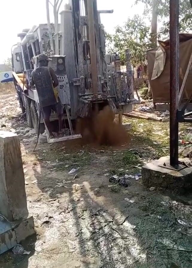 A man operates a drilling rig on a truck in a muddy, sunny outdoor area. The rig is actively drilling, ejecting a cloud of brown soil and water. Debris litters the ground, and there is a temporary shelter nearby. The man, wearing a tank top, stands on the truck's rear platform operating the machinery. Trees are visible in the background. A concrete barrier is on the left side of the frame.