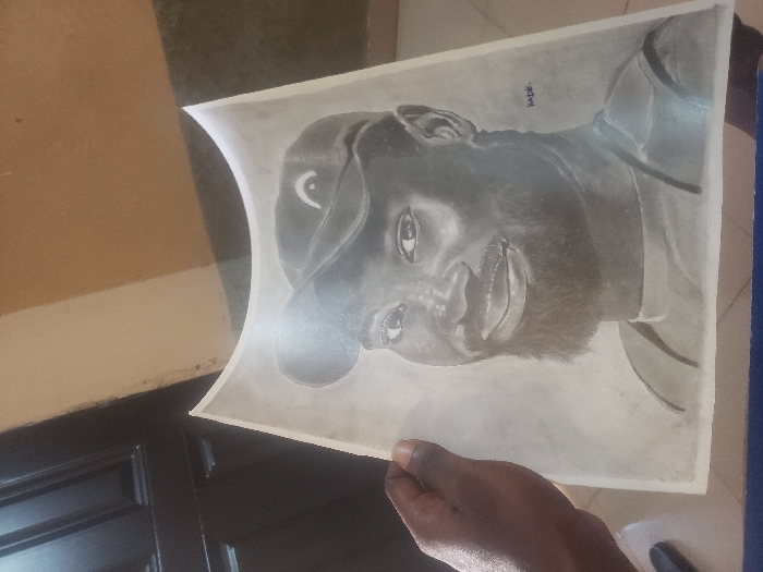 A charcoal or pencil drawing of a male subject is held by a dark-skinned hand in Kaninkon, Nigeria