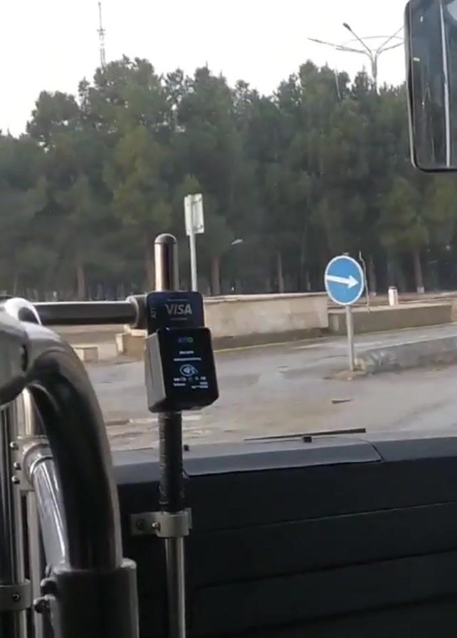 view from inside a moving bus, focusing on a card payment terminal attached to a handrail. The terminal displays Visa and Atto logos. Through the bus window, a park-like environment is visible with trees, benches, a road, and a sign for "TEXNIK". The weather appears overcast.