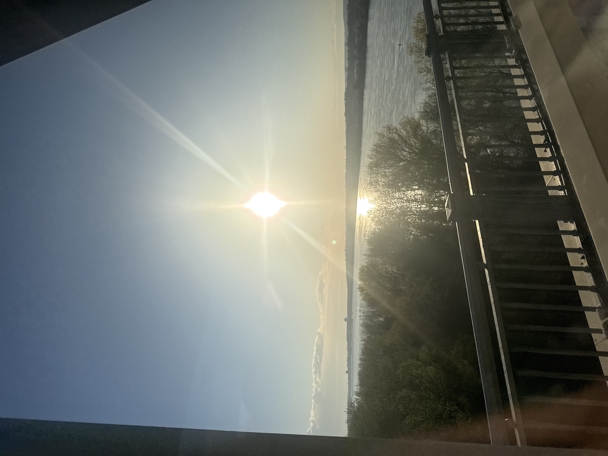 The image captures a sunrise over the Danube River, as viewed from a balcony in Giurgiu, Romania. The sun is centrally positioned in the sky, casting strong rays and causing glare. Part of a metal railing is present on the right, next to trees along the riverbank on the right side of the railing. A body of water reflects the sunlight, with land visible on the opposite bank. The sky transitions from blue at the top left to a bright, hazy white where the sun is. Parts of the balcony or building structure can be seen on the left and bottom of the frame. There is no sign of any human activity or people present.