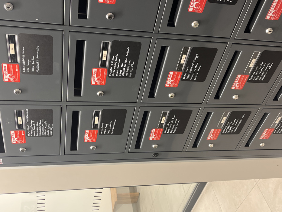 - "This image depicts a wall of numerous dark grey, metallic mailboxes arranged in a grid, likely within an indoor common area of a residential or student housing complex in Villeneuve-d'Ascq, France" by FM-NQrs03, licensed under CC BY 4.0