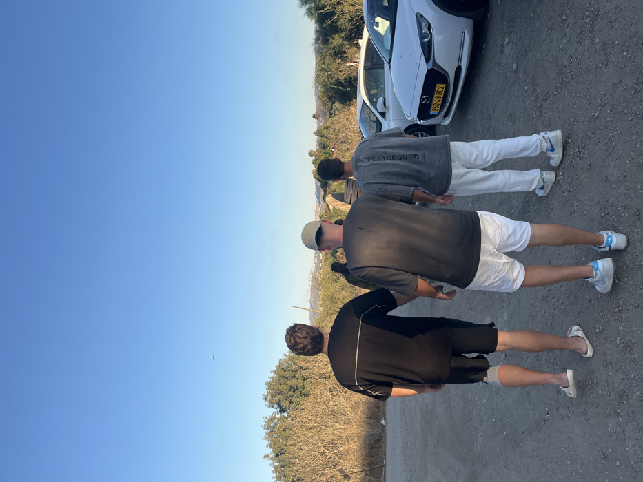 The image depicts three adult males walking away from the camera on an unpaved dirt and gravel path in Kfar Ruth, Israel, under a clear blue sky. The leftmost male wears a black short-sleeved t-shirt with two horizontal white stripes across the upper back and white accents on the sleeves, black shorts, and white slip-on sandals. A light-colored bandage or brace is visible on his left upper calf. His hair is dark and medium length. The central male wears a dark grey short-sleeved t-shirt, white shorts, light-colored athletic shoes with blue accents, and a light-colored baseball cap on his head. The rightmost male wears a grey short-sleeved t-shirt with "PLAYGROUND" printed vertically in a distressed font on the back, white long pants, and light-colored athletic shoes with blue accents. His hair is dark and short. In the background, on the right side of the path, two white sedans are parked. The closer vehicle is a white Mazda 3 (BP chassis) with Israeli license plate 850:49-802. Behind it, a second white sedan is partially visible. Further back, sparse, dry vegetation lines both sides of the path, with a distant landscape of hills and scattered buildings. A small white aircraft is visible high in the clear blue sky, in the upper left quadrant. A wooden structure, possibly a bench, is partially visible on the right behind the central figure.
