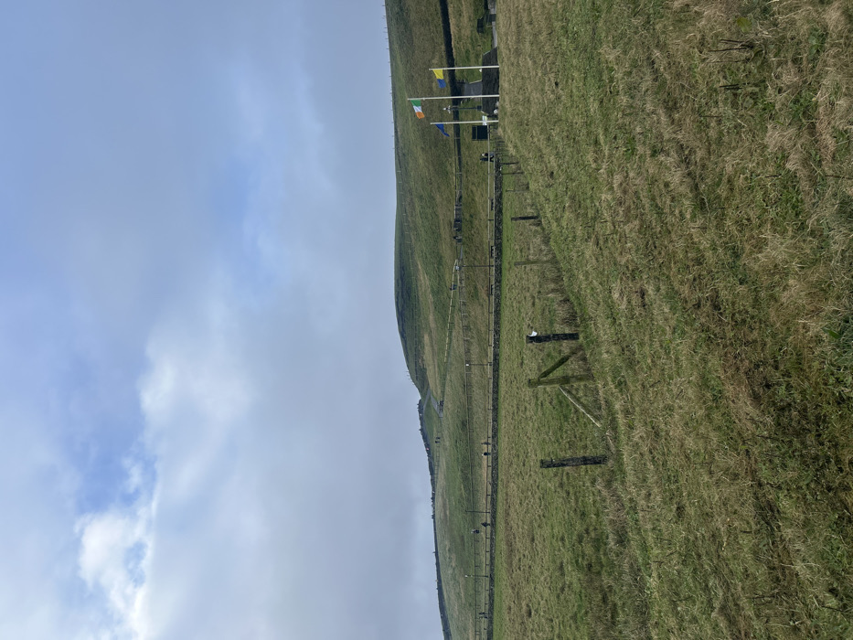 The scene depicts an overcast, hilly, grassy landscape in Unknown, Ireland. In the immediate foreground, a field of green and dried brown grass slopes upward, featuring a rustic wooden fence line with three dark posts and a slanted cross-member. In the middle ground, a dark, narrow paved path runs horizontally, bordered by a low stone wall. Several small, dark human figures are dispersed along this path, appearing to walk from left to right. Beyond this path, another, wider paved path is visible. To the right in the middle ground, a stone or concrete monument stands prominently, displaying three flags on poles. From left to right, these are: the Irish national flag (green, white, and orange vertical stripes), a blue flag with yellow stars (consistent with the Flag of Europe), and a plain yellow flag. Steps appear to lead up to this monument from the right. The background is dominated by rolling green hills, extensively covered in grass. Multiple winding dirt or grass paths traverse these hills, leading upwards and curving out of view. Scattered along these higher paths are numerous small, dark figures, indicating people walking or hiking. The sky above is largely covered by diffused gray and white clouds, with hints of brighter blue sky peeking through.