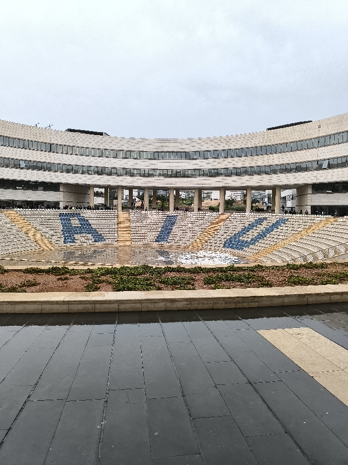 A curved, multi-story building with numerous windows overlooks an outdoor amphitheater-style seating area. "AUC" is painted in blue on the steps. A small garden separates the seating from a wet, tiled plaza in the foreground. The sky is overcast. The architecture is modern and symmetrical.