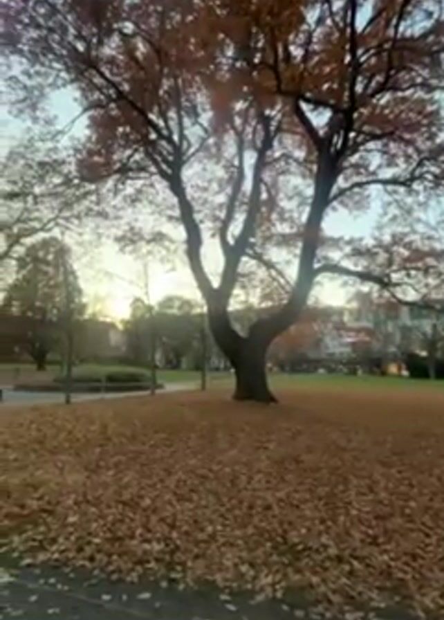 park scene in the autumn. The ground is covered in fallen leaves, primarily brown and orange. There is a large tree in the foreground with many brown leaves. The camera pans slightly, revealing a paved walkway. The park has some benches and small flowerbeds. The sky is a pale blue, and the setting sun creates a warm glow in the distance, silhouetting the buildings visible in the background. There's a pergola structure visible near the path. No people are visible.