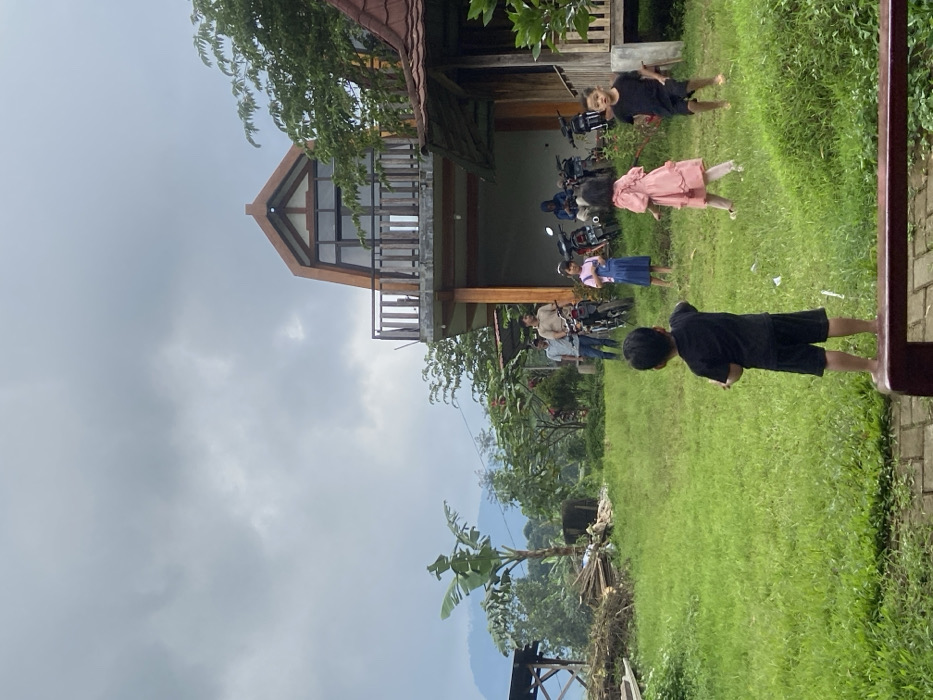 The image depicts an outdoor scene in Penanggungan, Indonesia, under a heavily overcast sky. In the foreground, a dark red railing partially obscures the bottom edge. Four children are present on a sloping green grassy area. A young boy in a black t-shirt and shorts stands with his back to the viewer, facing towards the center. To his right, a girl in a pink ruffled dress is walking to the left. Further right, another young boy in a black t-shirt and shorts moves towards the left. A girl in blue denim overalls stands stationary to the left of the girl in pink. In the midground, towards the right, stands a multi-story building featuring an A-frame upper section with large windows and a balcony with wooden railings. The lower level is open, revealing a concrete area where several motorcycles are parked. Three adult males are visible near the motorcycles; one in a light beige shirt and another in a light blue shirt stand upright, while a third is seated on a motorcycle. To the immediate right of the main building, a smaller structure with a reddish-brown tiled roof is partially visible. The left side of the scene includes a tall banana tree, a pile of wood debris, and a wooden frame structure. Distant mountains or hills are visible through a haze in the background beneath the cloudy sky. The ground throughout the visible area is primarily green grass, indicating an uneven, natural terrain.
