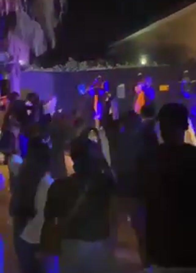 A group of people are gathered and dancing at an outdoor event at night. Blue and purple lights illuminate the scene. Some people are recording with their phones. A palm tree and a building are visible in the background. Some individuals are standing on an elevated platform. Some of the attendees are wearing casual clothing, like plaid shirts and animal print patterns. The scene appears lively and celebratory.