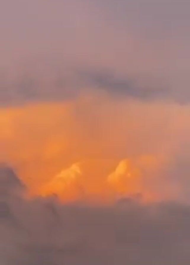 view of the sky, with grey and peach-colored clouds. Some of the clouds appear to have an orange or yellow glow from behind them, possibly from the setting sun. Distant sounds, including unintelligible human speech, are audible.