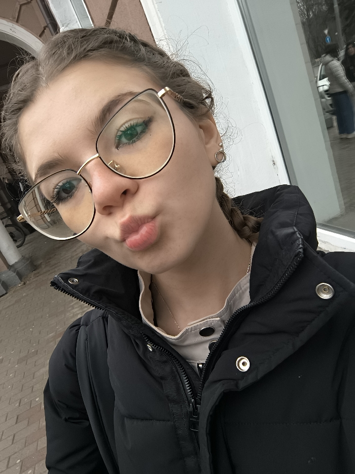 The image depicts a close-up, slightly upward-angled selfie of a young female individual standing outdoors in the city of Unknown, Unknown. She has light skin and green eyes, accentuated by large, gold and black framed cat-eye glasses. Her brown hair is styled in braids, with some strands loose around her face. Her lips are pursed into a "kissing" or "duck face" expression. She wears a black puffer jacket, partially unzipped, revealing a light beige or cream-colored collared top with black snap buttons and a thin silver-colored necklace. Small, circular, gold-toned stud earrings are visible in her earlobes. The background on the left side of the frame shows a segment of a building with an arched architectural feature and what appears to be reddish-brown brickwork or pavement. The right side of the background consists of a large reflective glass surface, likely a window or door, which mirrors a blurred street scene. Reflected elements include a person wearing a light-colored jacket and blue jeans, a white vehicle, and a blue circular road sign. The visible ground in the background and reflections is paved with interlocking brownish-grey blocks or bricks. The scene appears to be an urban outdoor setting.