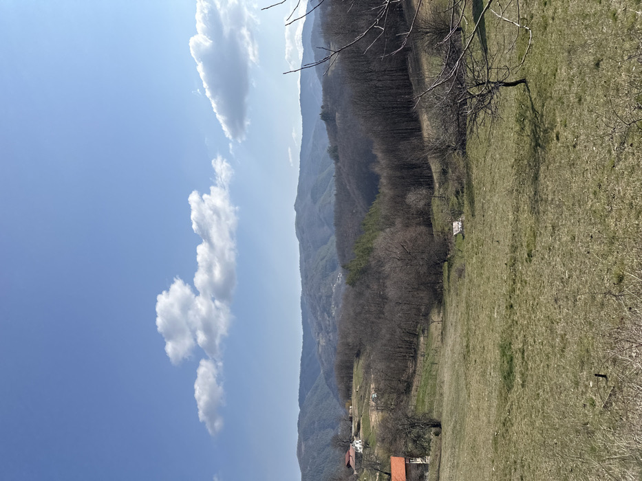This image depicts a wide landscape view in Borinovo, Bulgaria, under a clear blue sky with scattered white cumulus clouds. The scene is dominated by undulating terrain, suggesting a mountainous or hilly region. In the immediate foreground, sparse, dry green and brown grass covers a gently sloping field. Bare branches of deciduous trees are visible on the right, with a small, leafless tree casting a short shadow in the lower-right midground. The midground features a transition from the grassy field to denser clusters of trees. On the left, two residential structures are discernible. The lower house possesses light-colored stone walls and a prominent orange/red tile roof. Further up the slope, a second house with a darker roof is partially visible. Between these structures and extending into the valley, deciduous trees stand largely bare, indicating late winter or early spring. A small, light-colored wooden structure, possibly a shed or utility cover, is situated near the bottom center of the midground, partially recessed into the terrain. A faint fence line or row of posts crosses horizontally through the midground. The background consists of multiple layers of forested hills and mountains, receding into a blue haze. These distant slopes display a mix of bare deciduous and darker evergreen trees. No people or overt actions are visible within the frame. The lighting suggests midday conditions with bright sunlight.