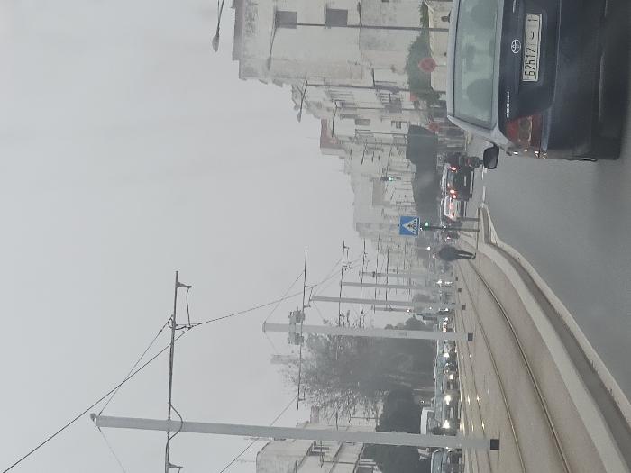 A street scene shows a black car partially in view on the right, with a license plate visible. Across the street, a person crosses at a pedestrian crossing with a green light. Tram tracks run down the center of the street, lined by electrical poles. Buildings are visible in the background, shrouded in a hazy atmosphere. Cars are lined up on the street, waiting for traffic.