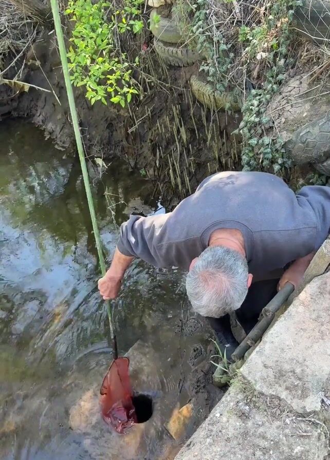 A man wearing a grey shirt and dark pants is bent over a murky stream, using a long bamboo pole with a red net at the end to retrieve something from a black hole in the water