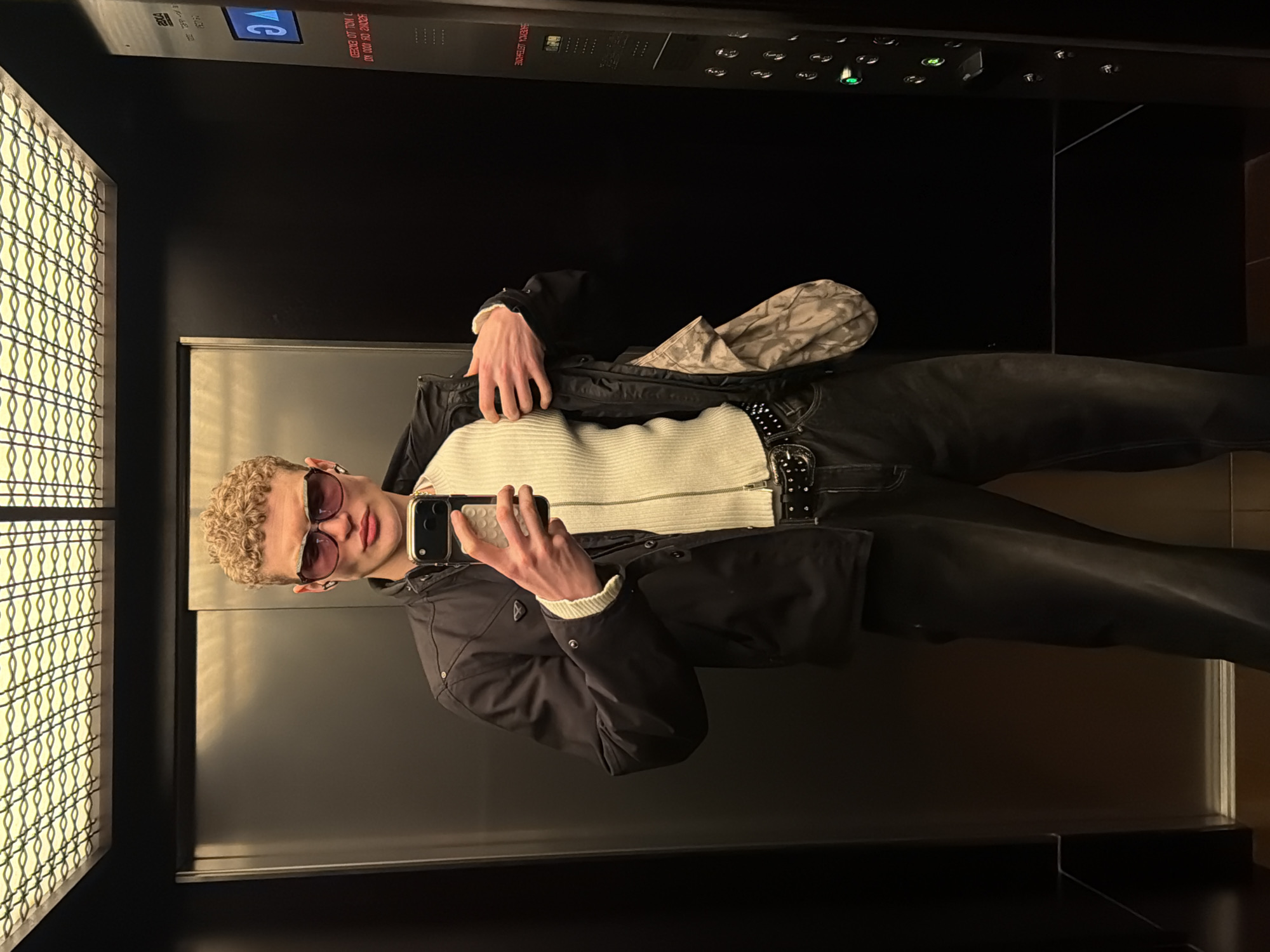 A fair-skinned young adult stands within an elevator, facing their reflection in the mirrored wall