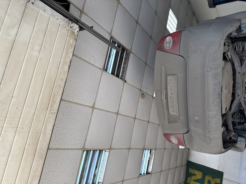 The image displays the rear of a dusty, light-colored passenger vehicle, likely a sedan or hatchback, elevated within an auto service bay in Rybinsk, Russia
