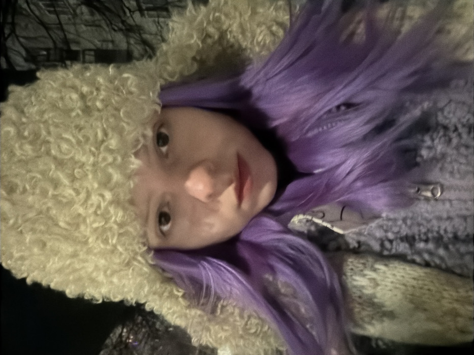 A close-up captures a person with lavender hair and a curly, cream-colored hat. Their face is angled towards the camera, revealing light skin, brown eyes, a small nose, and slightly parted lips. They are wearing a fuzzy, grey sweater, partially zipped up, with a glimpse of a patterned shirt underneath. The background appears dark and out of focus. The image is slightly rotated.