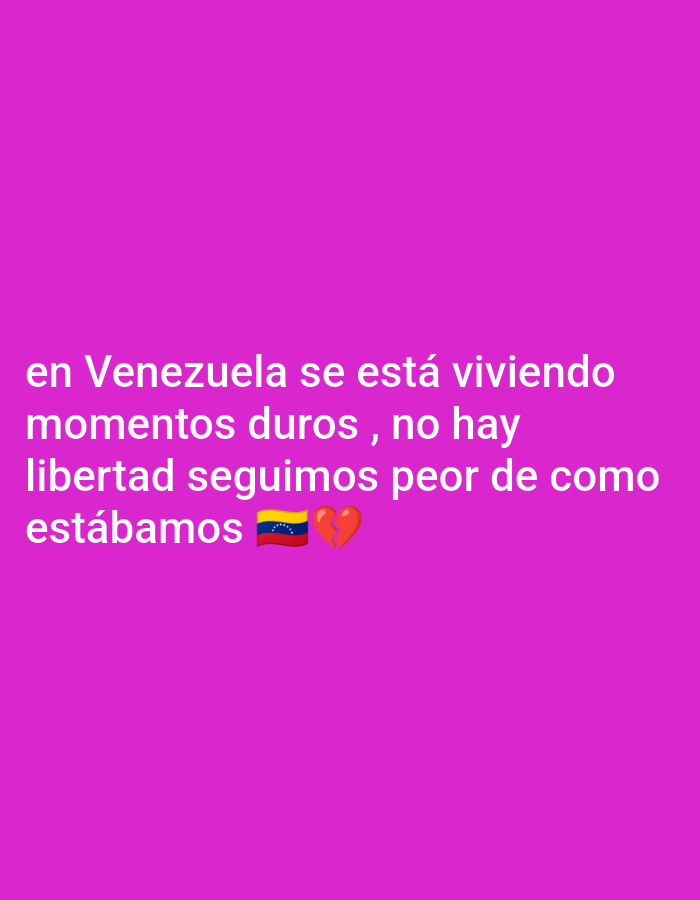 The image displays text against a solid magenta background. The text, written in Spanish, translates to "In Venezuela, we are living hard times, there is no freedom, we are worse off than before." After the text, there's an emoji of the Venezuelan flag followed by a broken heart emoji, visually conveying a sense of hardship and loss of freedom in Venezuela.