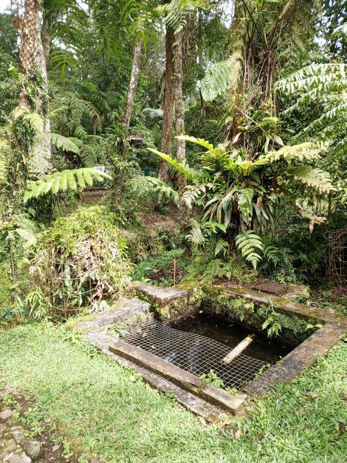 This image depicts a dense, tropical forest environment, likely within Bà Nà Hills, Đà Nẵng, Vietnam. In the foreground, a rectangular concrete basin, approximately 1.5 meters long and 1 meter wide, is partially filled with dark water. The concrete walls are weathered, displaying moss and algae growth. A metal grate, composed of a grid pattern, covers the left two-thirds of the basin's opening. A light-colored, perforated pipe is partially submerged in the water on the right side of the basin. The ground immediately surrounding the basin is covered by short, well-maintained green grass, transitioning into a dirt path on the far left. To the left of the basin, a conical wire mesh structure, heavily overgrown with green and brown foliage, stands amidst the grass. The mid-ground and background are dominated by a lush, thick forest canopy. Numerous tall tree trunks, some slender and others robust, rise vertically, covered with moss and epiphytes. Abundant large-fronded ferns and various leafy plants constitute the dense undergrowth and mid-level canopy. In the upper-mid-background, partially obscured by foliage, a small building with a reddish-brown tiled roof and visible green structural elements or railings can be seen. No people are present, and no discernable actions or interactions are occurring. The scene is evenly lit, suggesting ambient daylight filtered through the canopy.