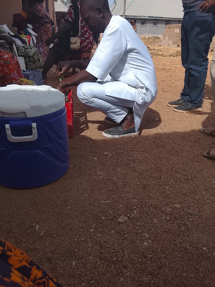 An adult crouches beside a large, blue cooler, his attention focused on a red object beside it. He wears a short-sleeved, white shirt, matching pants, and dark slip-on shoes. Several people stand around, including one in blue jeans and another with a patterned shirt and shoulder bag. The scene appears to be outdoors on a dirt-covered ground. A building is visible in the background.